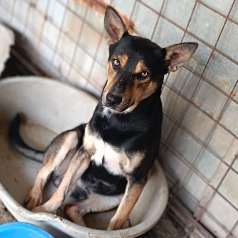 EFFY – Effy was rescued when she was very small along with her siblings. Sadly, she is still waiting for her forever home at 1 year old. We don’t want to see her grow up in kennels. She is timid but friendly and loving when she learns that she’s safe!